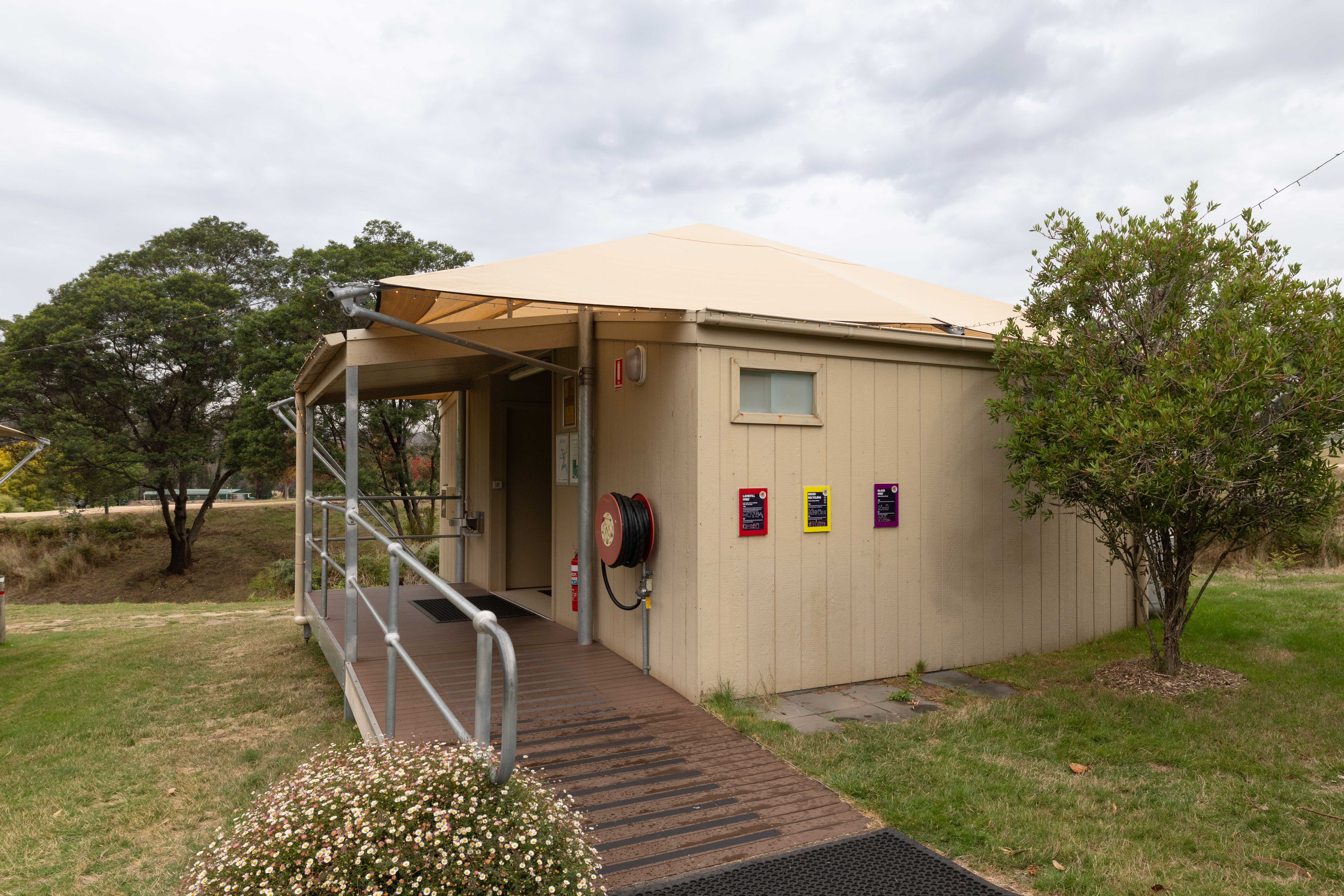 Accessibility: Glamping Tent 3 features an access ramp, and the nearby shared bathroom amenities include an access ramp, accessible toilet and shower.