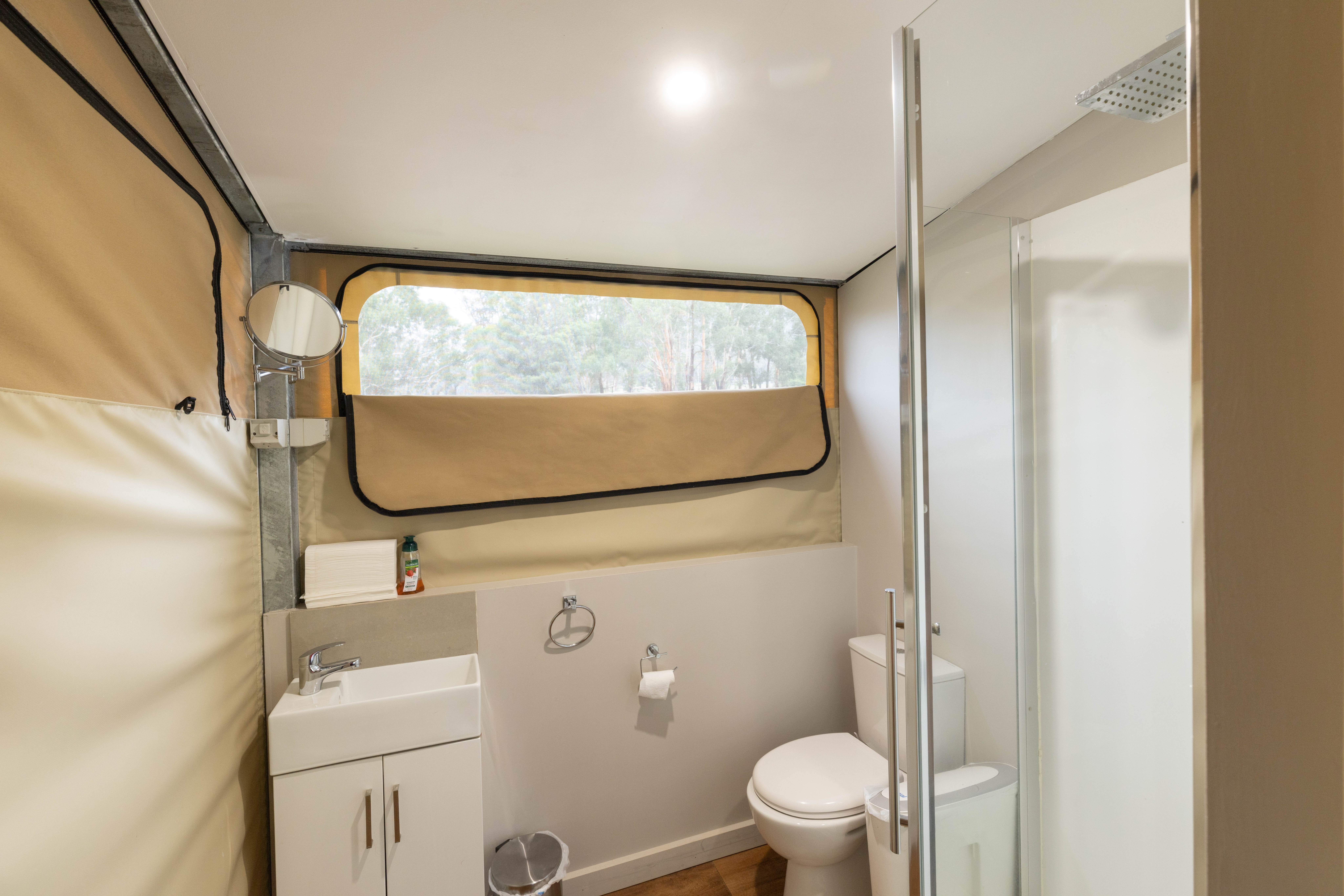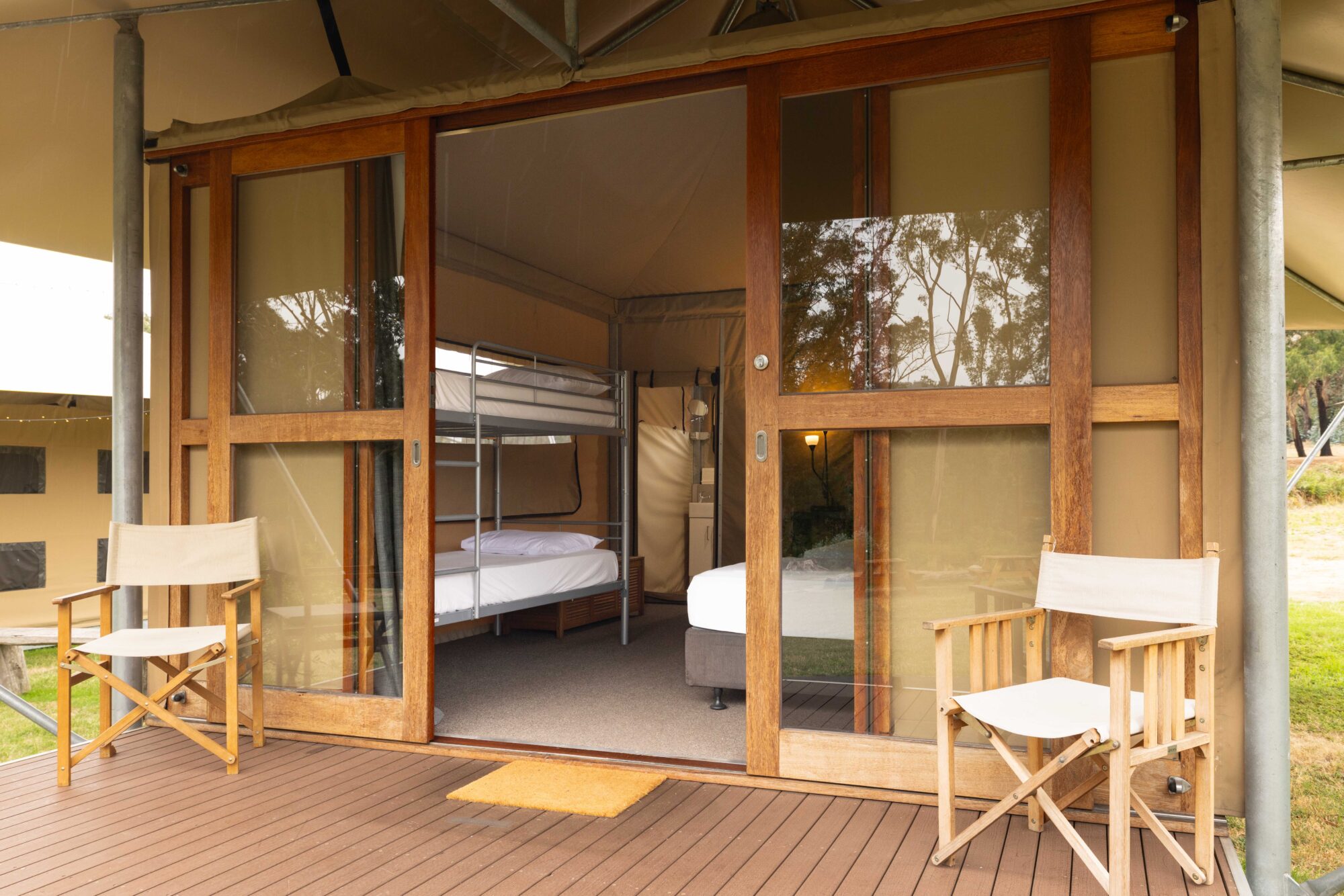 Glamping Tent 5 – Sleeps up to 4 guests with bunk and flexible bedding configuration to allow King bed. Ensuite Bathroom.