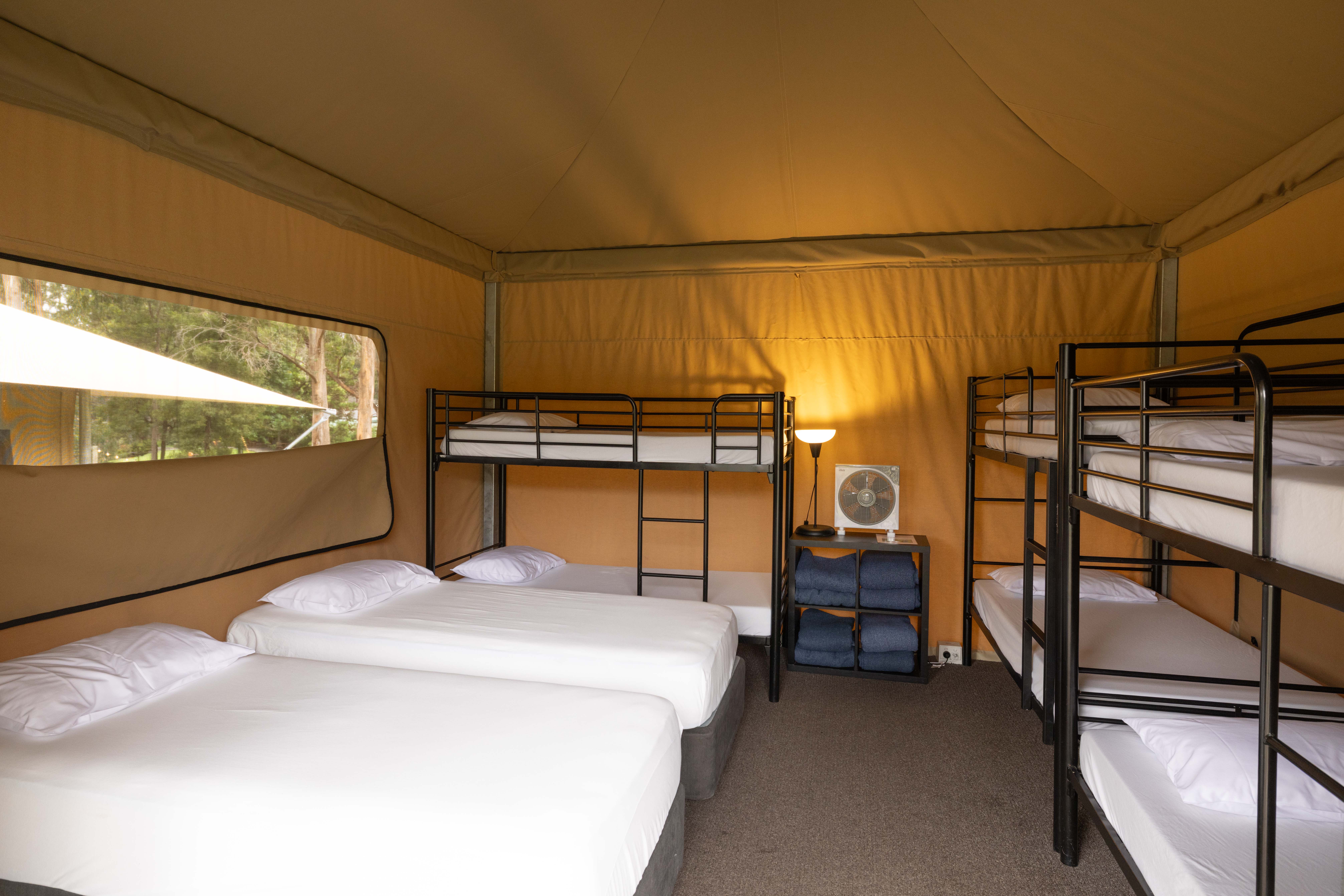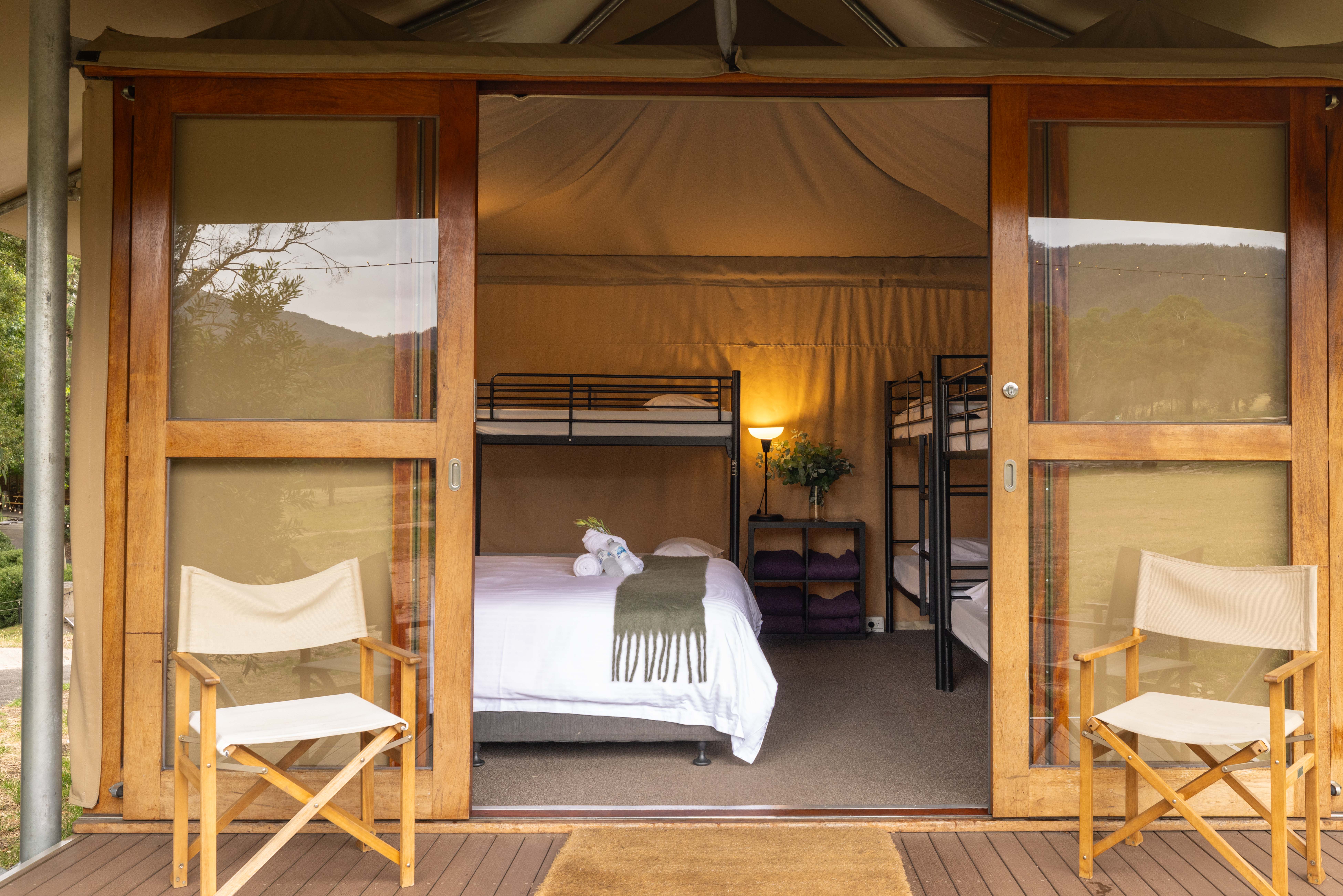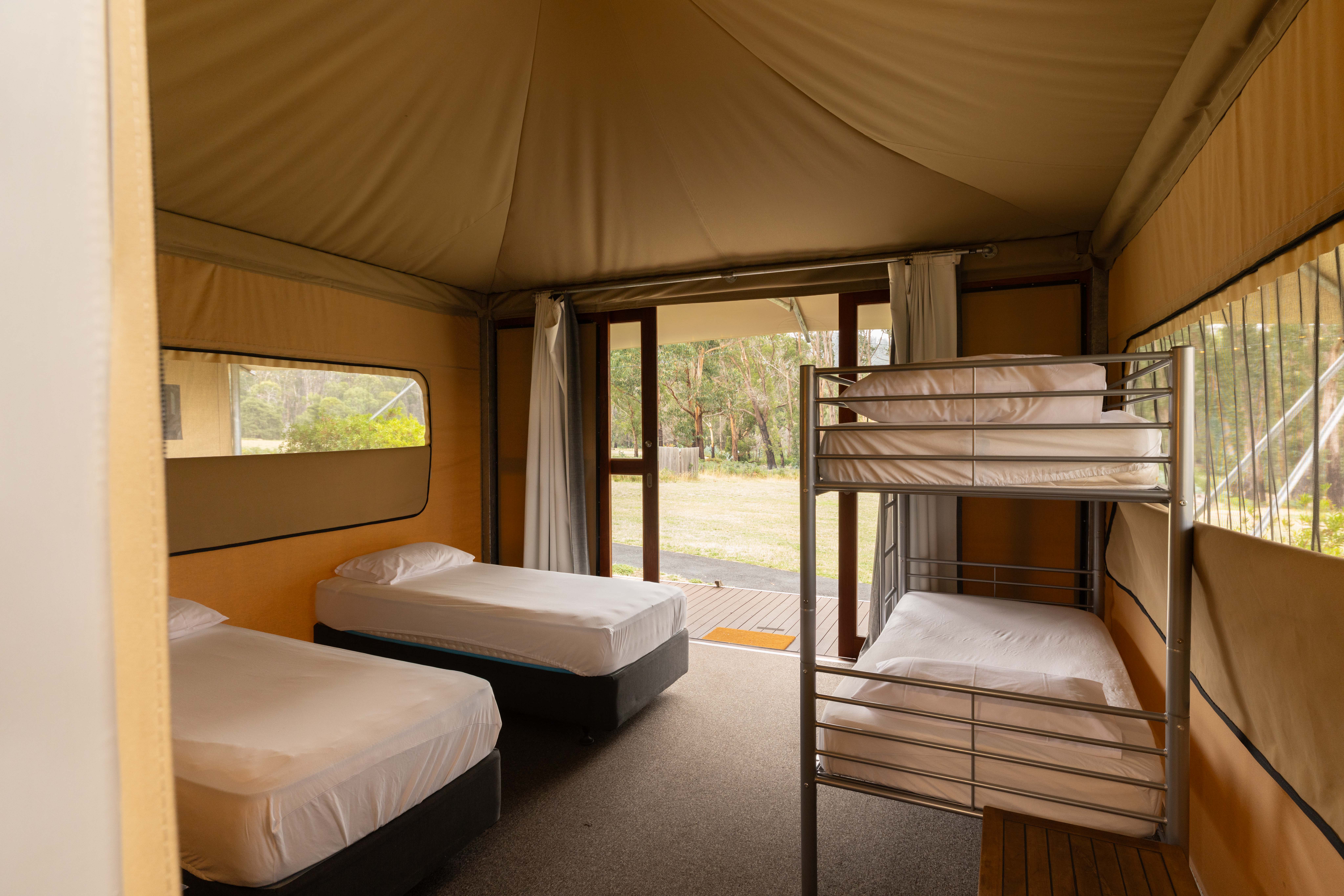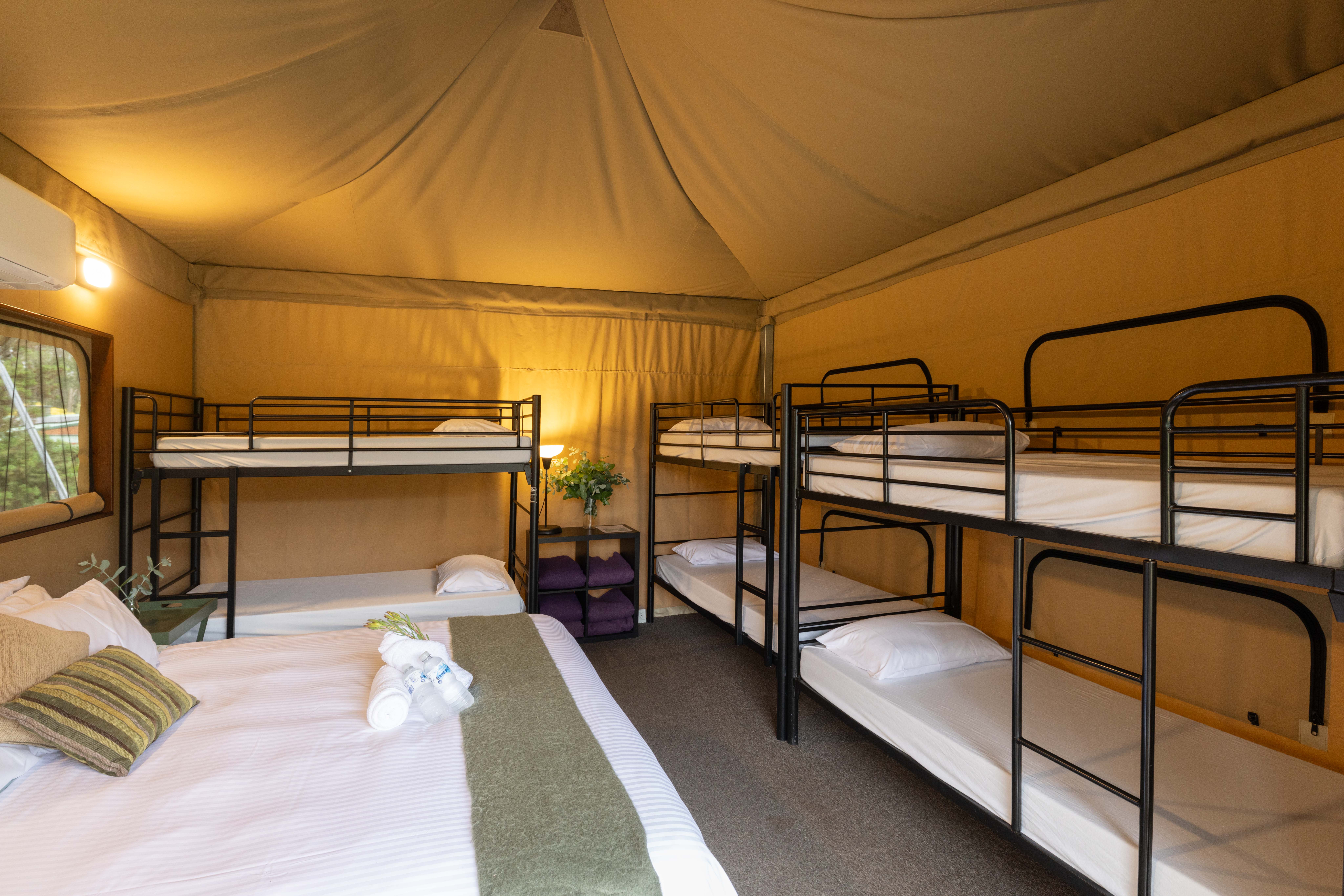 Tents feature flexible bedding layouts, with combinations of bunk beds, single beds and king beds depending on configuration. Two tents include private ensuite bathrooms, while others utilise nearby shared bathroom facilities.