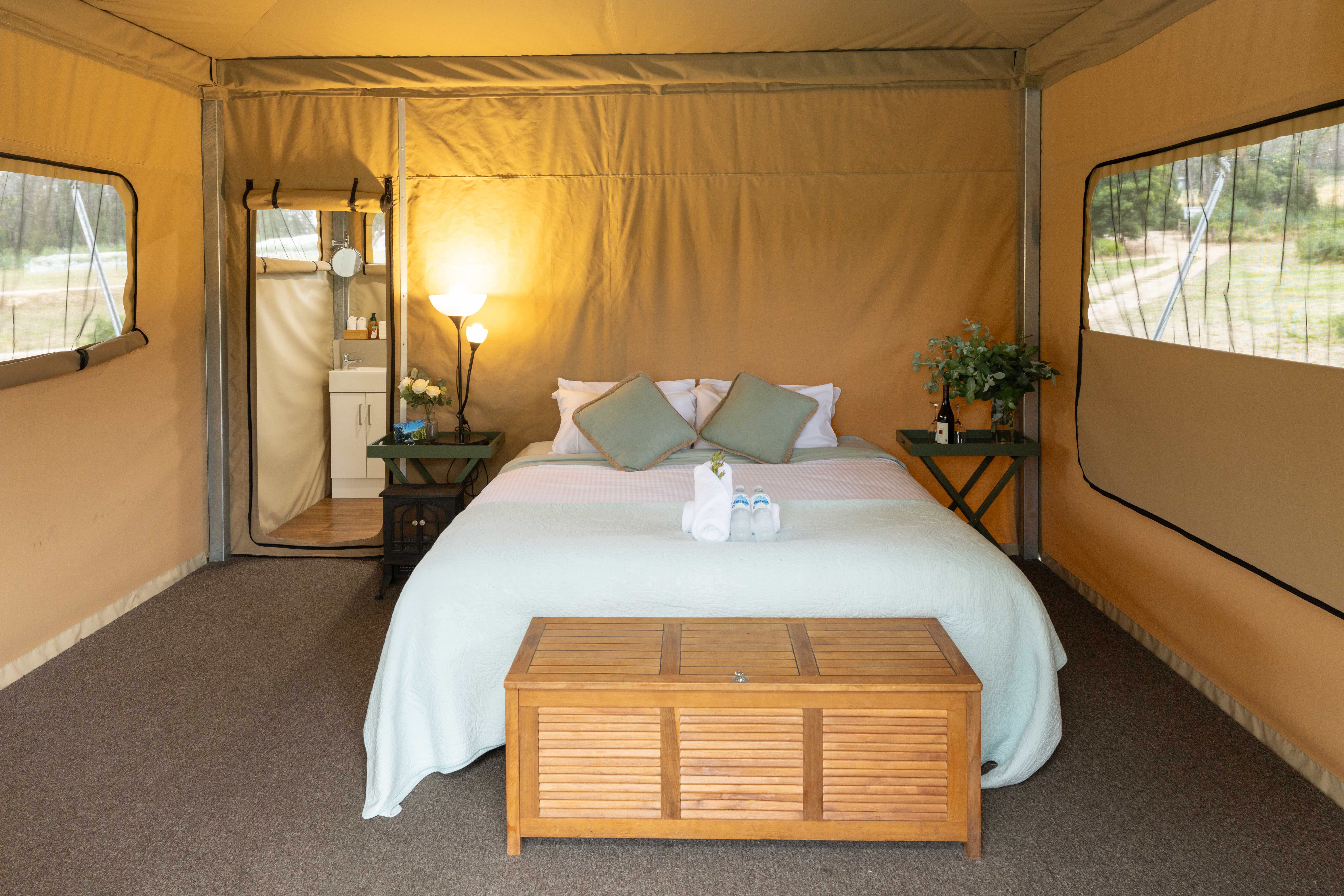 Glamping Tent 6 – Sleeps up to 4 guests with flexible bedding configuration to allow King bed and optional bunk bed. Ensuite Bathroom. This tent is often used as our ‘bridal’ suite.