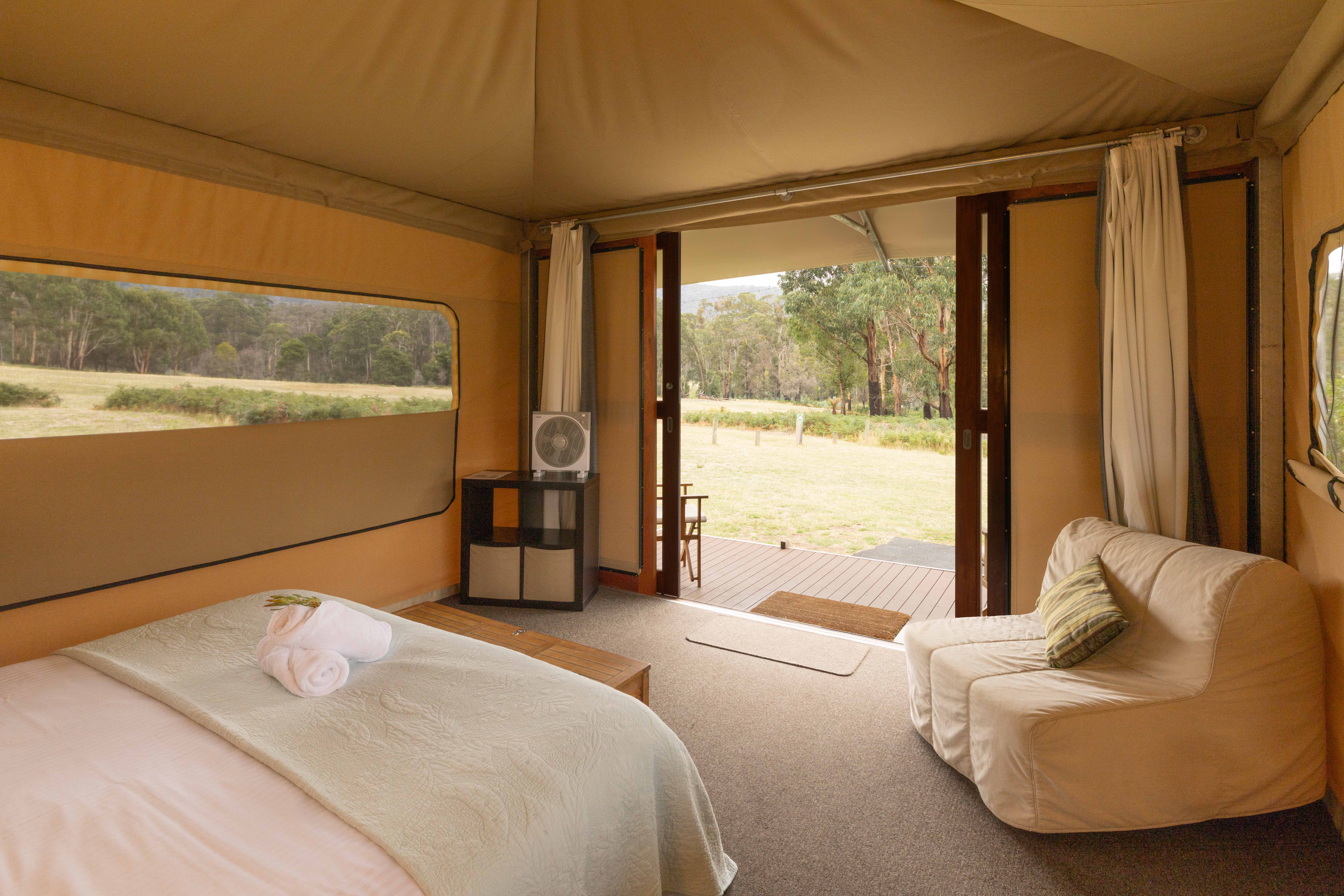 In Winter, all tents are equipped with a small electric heater, additional woollen blankets, and hot water bottles (hot water bottles available for non‑school groups only). During the summer months, a fan is provided. Lucky guests staying in Glamping Tent 1 have a reverse cycle air conditioner which we are currently trialling.